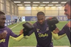埃弗顿前锋蒂尔诺·巴里在社媒晒出视频,盖耶与基恩手戴拳套,在裁判贝托的见证下,进行了一场“和好拳击赛”。