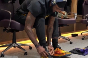 赛前,詹姆斯在更衣室哼着小曲,同时穿上了他最新一代签名鞋“詹23”。这将是詹姆斯首次在正式比赛中穿这双鞋(4万分纪念款配色)。