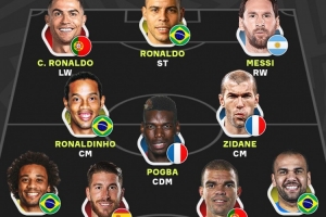 24直播11月20日讯 前金球得主本泽马评选出其心中的足坛历史最佳11人。该阵由诺伊尔镇守龙门,后防线由马塞洛、拉莫斯、佩佩和阿尔维斯组成。中场由齐达内、博格巴和小罗领衔,锋线则由C罗、大罗和梅西三位巨星构成。