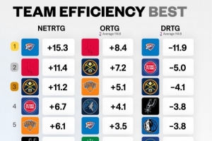 各队净效率&攻防效率排名!净效率&防守效率雷霆第1 进攻火箭第1