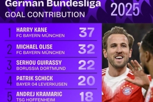 德甲2025年参与进球榜:凯恩37球、奥利塞32球,吉拉西、希克在列