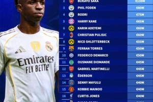 2027合同到期球员身价榜:维尼修斯1.4亿欧居首,萨卡1.3亿欧次席