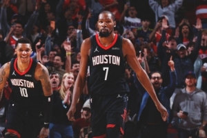 赛后火箭晒出赢球海报,杜兰特占据C位,小贾巴里·史密斯同框。