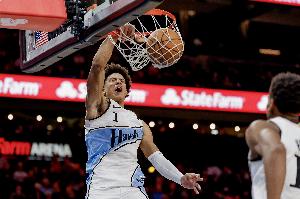 24直播11月23日讯 老鹰大胜鹈鹕,核心球员杰伦·约翰逊表现出色。他贡献18+11+9的准三双数据,正负值全场最高。近期他状态火热,场均接近25+12+9,投篮与三分命中率均超五成。赛季至今,他已成长为场均能贡献22分9.7篮板6.7助攻的全能锋线。