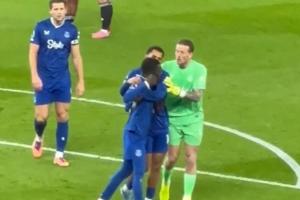 盖耶染红后情绪激动喋喋不休,皮克福德和恩迪亚耶抱住安抚,盖耶仍在挥拳似乎要打人。