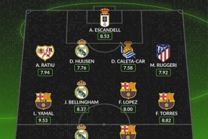 whoscored西甲本轮最佳阵:亚马尔、贝林领衔,巴萨4将、皇马3人